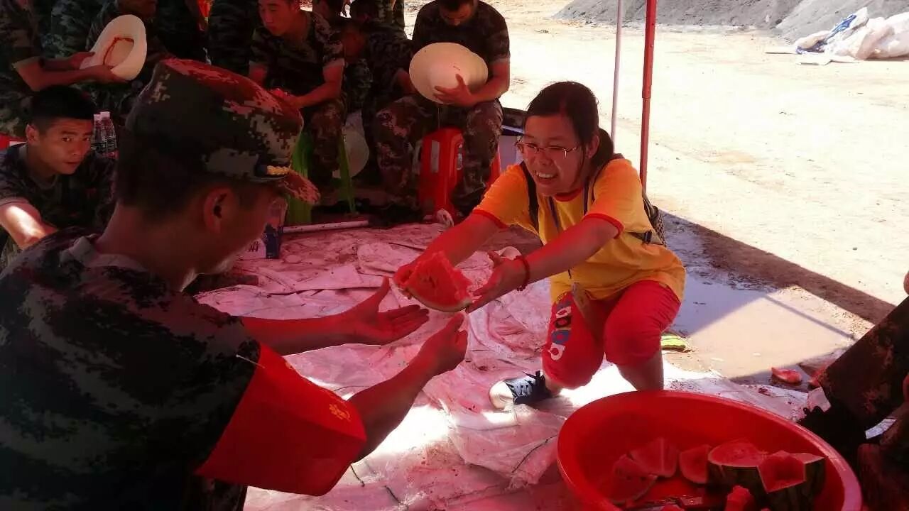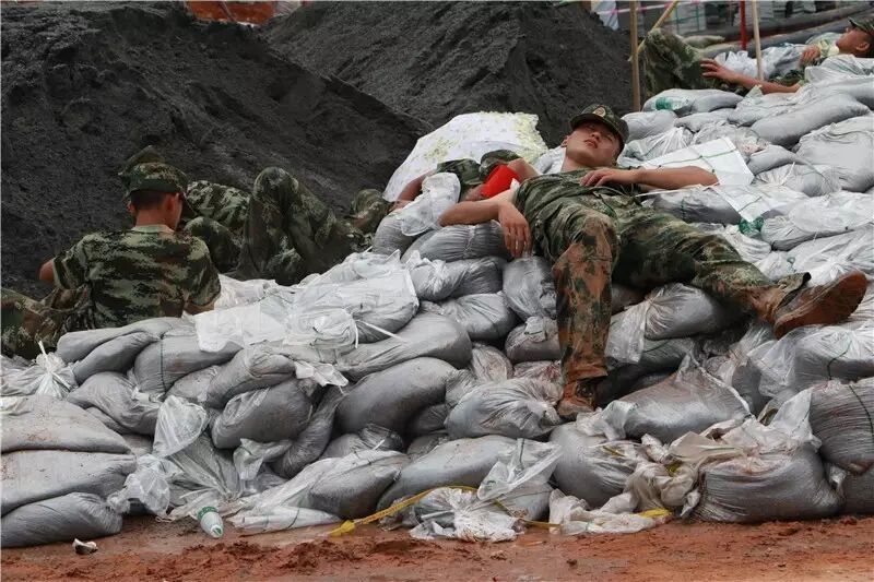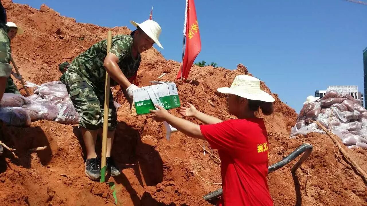 盛夏的阳光真像蘸了辣椒水,排险第一线没有一块阴凉地,他们就这样赤着胳膊,挽着裤腿,拿着铁锹、铲子一直忙碌着,装沙、扛沙袋……排险现场的义工们就这样默默地为他们做好后援,替他们递上一瓶水,一块冰西瓜,一碗银耳汤,替他们擦拭脸上的汗水……一幅幅暖心的画面,暖了他们,也温暖了我们。让我们向这群可爱的人致敬。