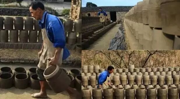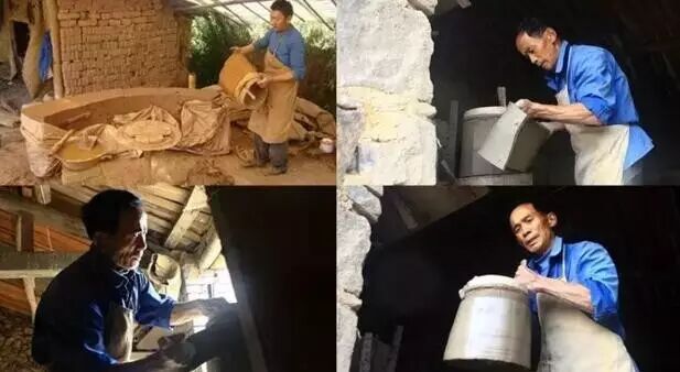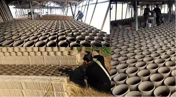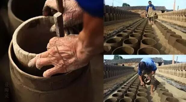 首先挖一个直径约十米左右的圆的料坑。先把地表面不能用的沙土和腐泥土挑走,留下能用的粘土,不够的要从其他地方取土倒进坑内。料坑要用水泡两三天,然后牵着两头水牛在坑内转圈踩土,直到把粘土踩匀。