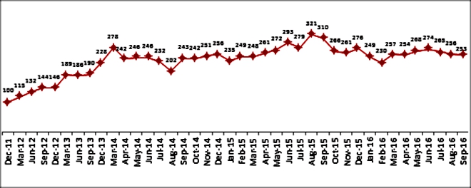 中国银行日前发布2016年9月份跨境人民币指数(CRI)。结果显示,9月份CRI指数为253点,较上月下降3点,较上年末下降23点。