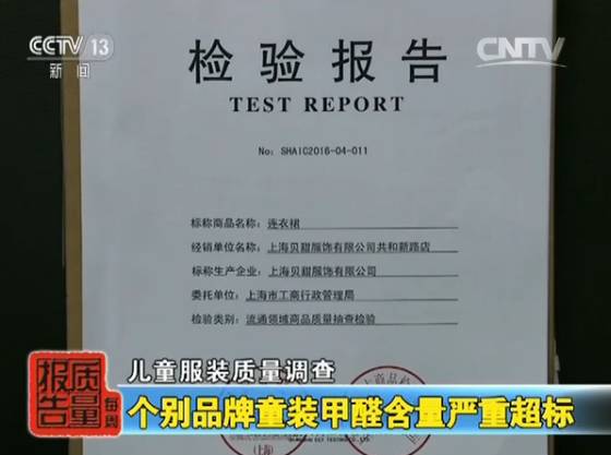 这次检测发现,标称由上海贝甜服饰有限公司生产的“贝甜Petit Avril”牌一款连衣裙,甲醛含量严重超标。专家指出,儿童服装上的甲醛超标,会经过两个途径进入到儿童体内,一是通过汗液,通过皮肤溶解到体内;另一个是儿童喜欢咬衣服,通过唾液,通过消化道进入到孩子的身体里面。