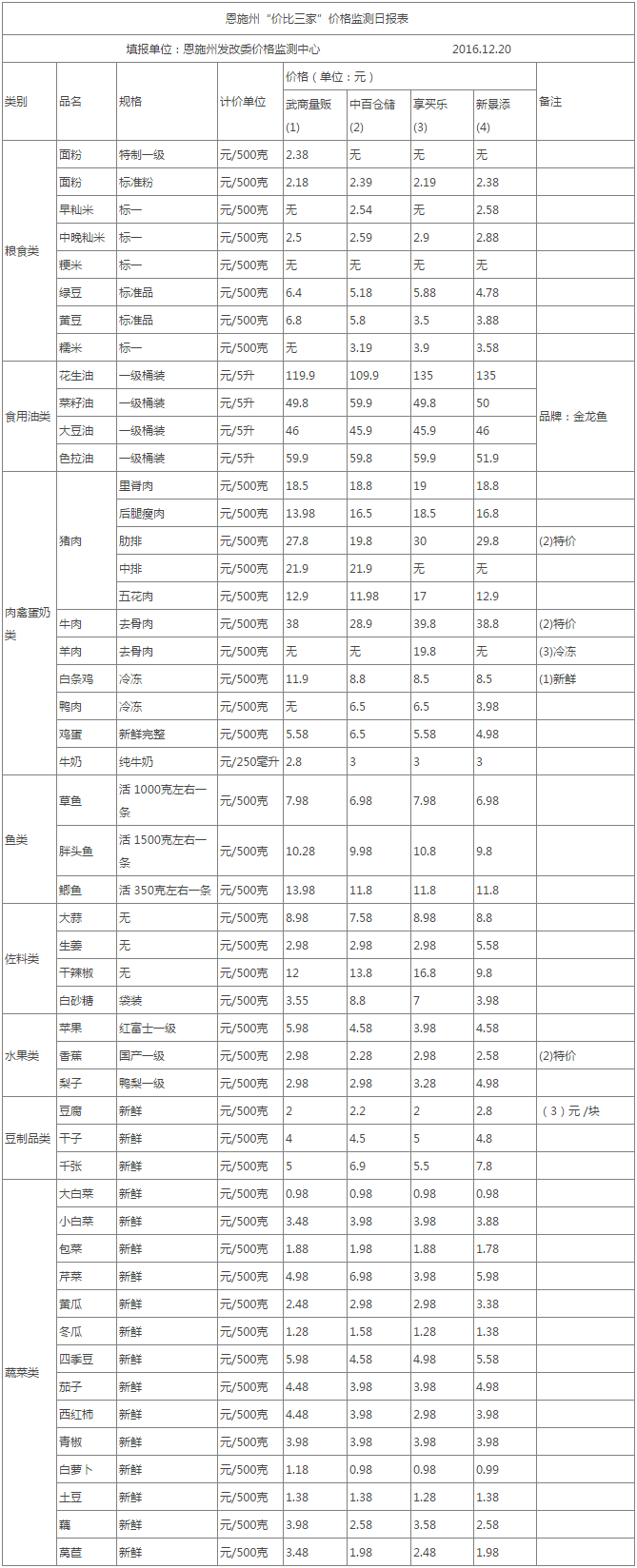 恩施州“价比三家”价格监测(2016年12月20日)