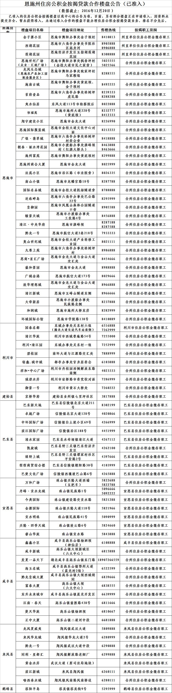 恩施州住房公积金按揭贷款合作楼盘新增8家,目前已有76家。新增的分别为: 一、恩施市(5家) 和润城 大地新居 清江新城 欣华理想城 广城金港 二、利川市(2家) 珑澄水岸 利川清江园 三、巴东(1家) 巴东新天地 附:恩施州住房公积金按揭贷款合作楼盘公告(截止2016年12月20日) 链接: 恩施州住房公积金按揭贷款合作楼盘公告(截止10月10日) 来源:恩施州住房公积金管理中心 (责任编辑 朱晓涵)