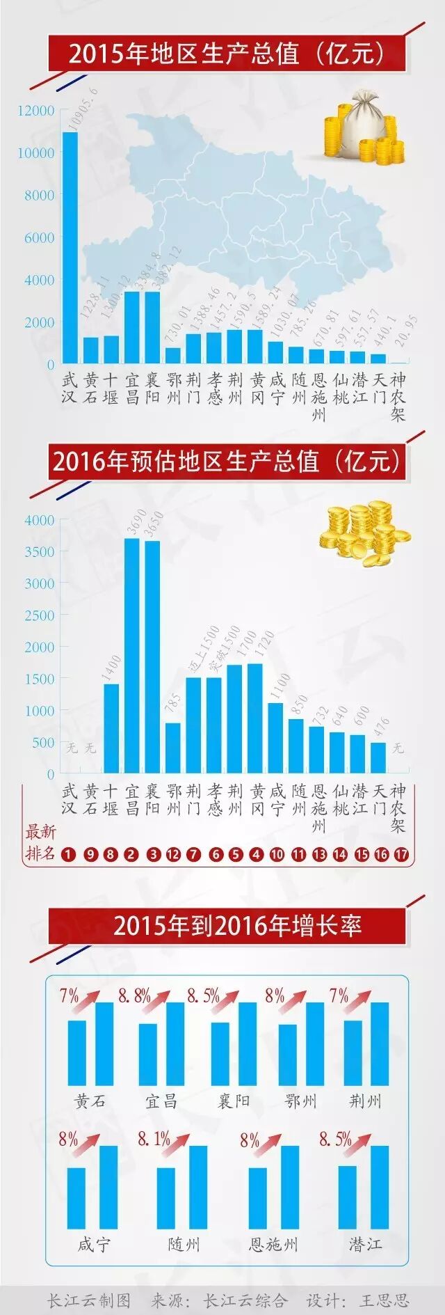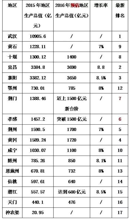 2015年地区生产总值一栏数据来源是湖北省统计局公布的《2016年湖北年鉴》,2016年预估地区生产总值以及增长率则来自于各地《政府工作报告》。有的地方同时公布了地区生产总值和增长率,有的地方则只公布了一项。