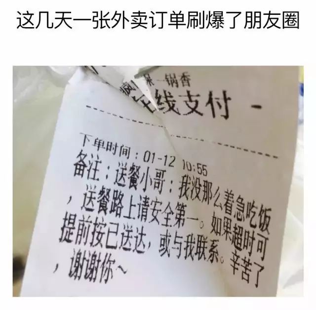 简简单单的两句留言, 写在一张外卖单上, 温暖了整个冬天 ▼ 留下这段“暖心备注”的于女士说 如果不是因为职业态度问题 送餐员迟到是可以体谅的 她只是在力所能及的范围内 给他们一些方便和温暖 愿这样的温暖和善意, 更多人都能感受到! 来源:蛙哥漫画(ID:mh4565)综合:每日经济新闻(ID:nbdnews) (责任编辑 朱晓涵)