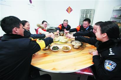 中午,趁着客流稍缓,一家人和该所部分民警补吃了一顿迟到的团年饭。饭菜十分简朴,而且时间紧张,大家吃得匆忙,很快又各赴岗位。