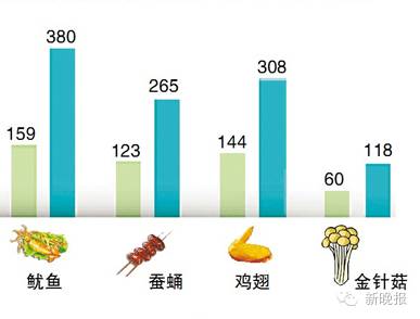 同时,实验测得主要的“烧烤搭档”每百克中嘌呤含量分别为:啤酒7毫克、白酒2毫克、鸡精518毫克、酱油(海鲜)58毫克、酱油(普通)28毫克、味精0毫克。