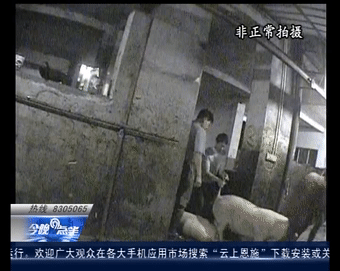 出乎意料,暗访组轻易就进入了厂区,整个厂区灯光昏暗,气味难闻,院子猪舍里还圈着不少活猪,有人正拿着钩子走进猪舍,左右打量挑宰杀目标。循着血迹,暗访组发现地上摆着三头还在淌血的猪。