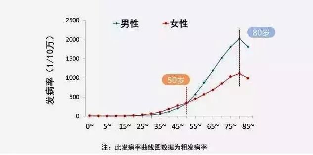 从年龄上来看,40岁之后癌症发病率快速提升,80岁时达到高峰。