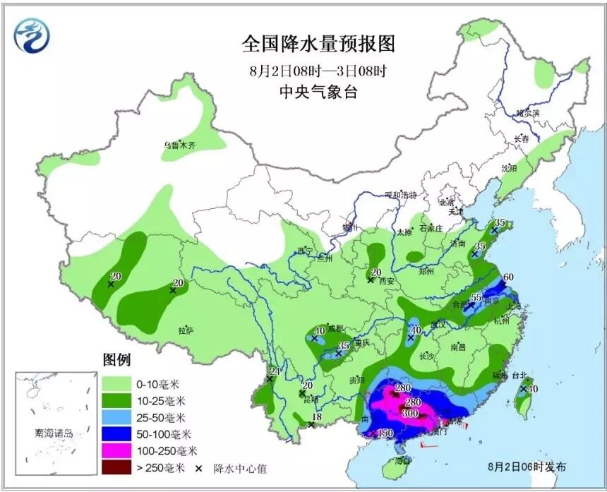 预计,8月2日08时至3日08时,南海北部、广东沿海及珠三角地区将有7~9级大风,部分海域和地区风力可达10级,阵风11~12级。广东、广 西大部、湖南南部、福建东南部、贵州东南部、台湾北部等地有大雨或暴雨,广东中西部、广西中东部等地的部分地区有大暴雨,其中,广东西部、广西东北部局地 有特大暴雨(250~300毫米)。中央气象台8月2日06时继续发布暴雨橙色预警。