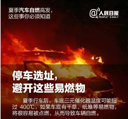 停车后检查汽车底盘,确认车下无易燃物。不要将易燃物品如气体打火机、空气清新剂、香水、摩丝等放在车内容易被太阳光线照射的部位,如仪表盘上;更不要将汽油、柴油等危险油品放在车内。