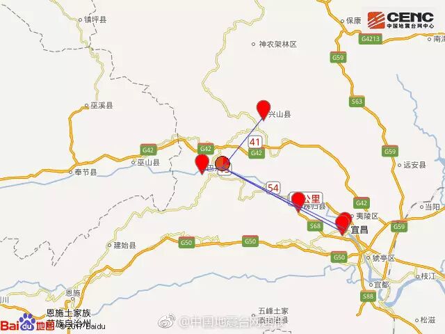 本次震中距巴东县13公里、距兴山县41公里、距秭归县54公里、距巫山县57公里,距宜昌市区86公里,距武汉市374公里。