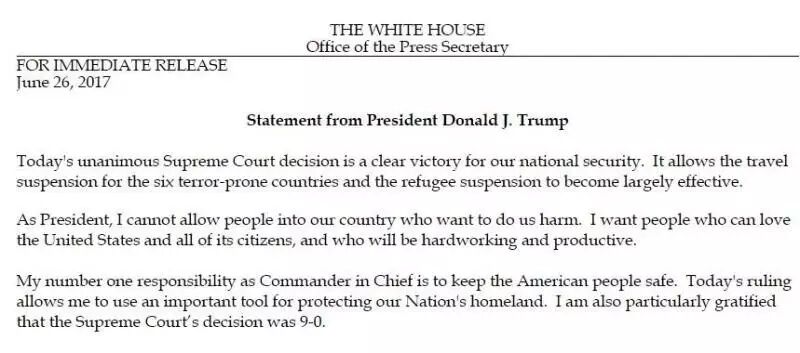 特朗普当天还通过白宫发表声明说,最高法院的决定对国家安全而言是一大“胜利”: