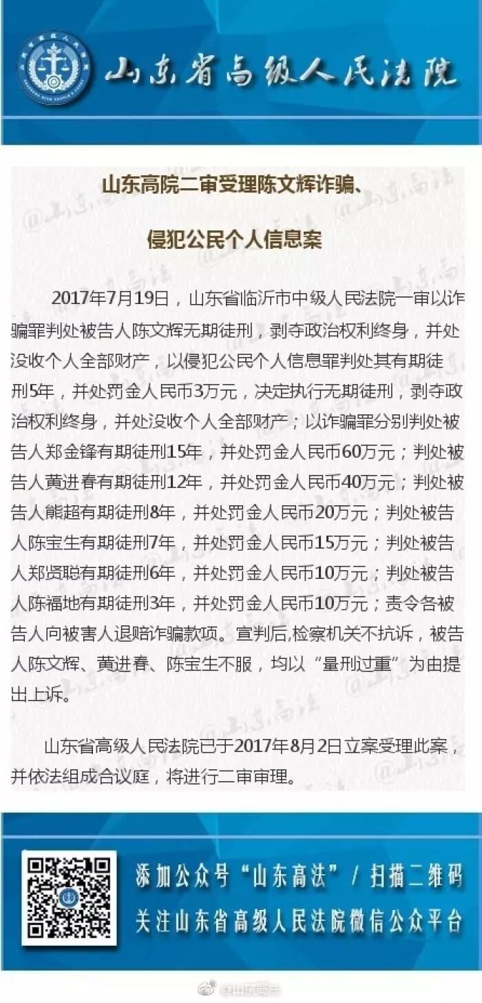 山东高院消息,“徐玉玉案”3被告陈文辉、黄进春、陈宝生不服一审判决,以“量刑过重”为由提出上诉,法院已受理,将进行二审审理。