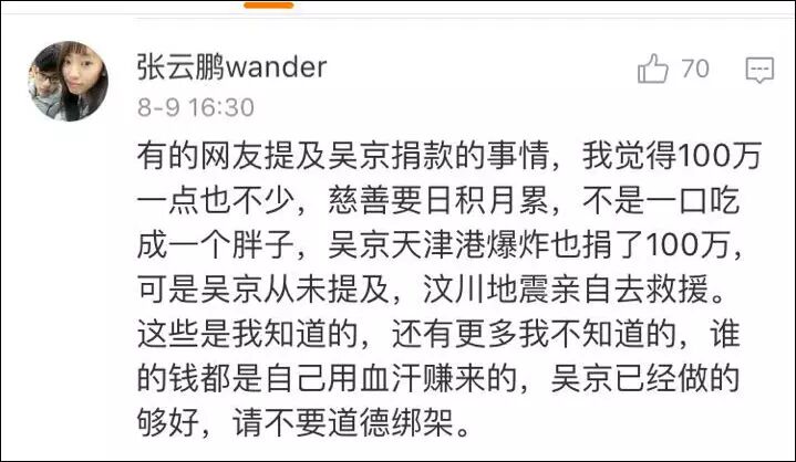 当知道吴京为四川灾区捐款100万的数额时,有网友说: