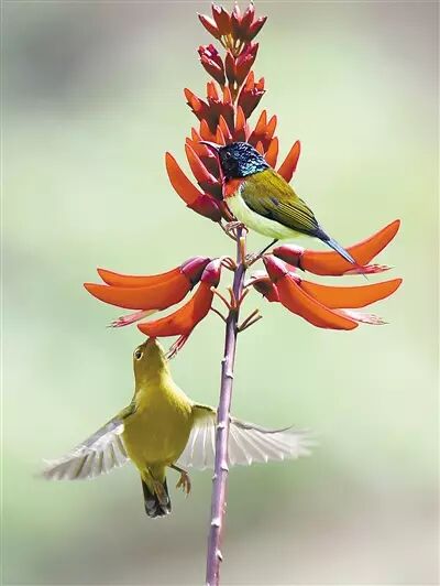 鸣声细尖、婉转动听的雌雄叉尾太阳鸟▼