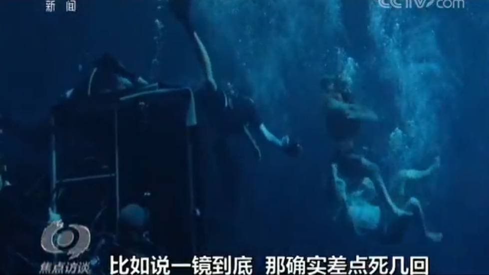 比如说一镜头到底,确实差点死几回,因为身上绑着铅块,为了下得快一点,往下沉,也没有力气了,漂不上来了,我真的是被人给拎上去的,给了我一口氧气。