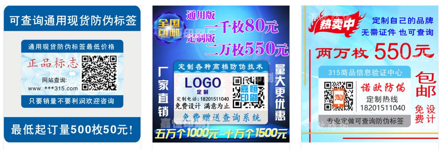 记者在某网购平台输入关键词“二维码防伪”,能搜到近千个相关结果。记者以买家身份与其中几家电商联系,他们表示,除了二维码防伪标识之外,还提供“激光镭射防伪”“温变火烤防伪”“滴水消失防伪”“荧光防伪”等多种市场上较流行的防伪技术服务,并有电话、微信、网络、二维码等多种查询方式。