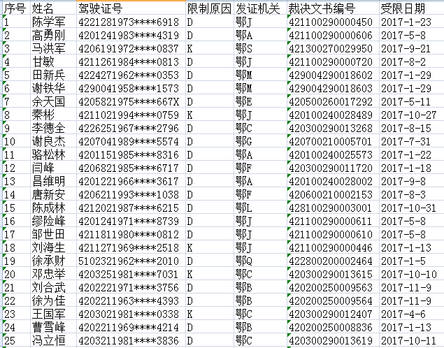 从2017年1月1日至11月20日,湖北省终生禁驾名单有陈学军,高勇刚,马洪军等在内的245位禁驾人。湖北交警提醒驾驶人自觉遵守交通法律法规,文明驾驶,安全出行,在遇到交通事故时千万不可以选择逃逸,同时也再次重申,广大驾驶员一定要做到喝酒不开车,开车不喝酒。