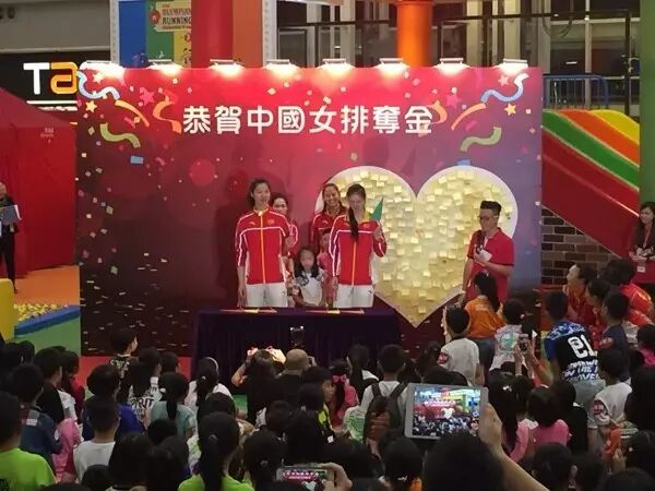 今天上午,中国女排来到位于九龙的一家商场,与一百名香港小朋友面对面交流、一起做游戏。中国女排先是齐声用粤语向当地的民众问好,然后分享了里约奥运会夺冠的心得和感受。