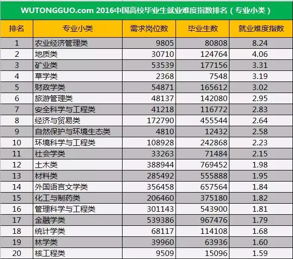 这十个专业情况有所不同,地质类、矿业类是由于中国经济放缓以及供给侧改革造成的需求量的减少;而经济贸易类岗位需求量并不低,但是由于此专业毕业生供给量更大,因此经济贸易类专业毕业生就业难度较大。
