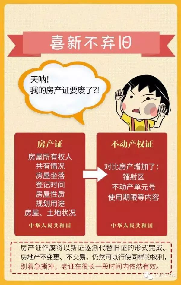 但就权利人的实质影响而言,不动产登记证明只是房产证、国土证等不动产统一后的新证明,可以为入学、就医、出国等作为证明和担保。旧的房产证并非一定要换“新证”。不动产登记机构坚持“不变不换”原则,权利不变动,簿证不更换,依法办理变更、转移等登记工作时,逐步更换为新的不动产登记簿证。