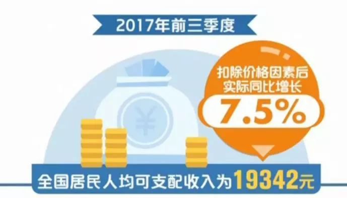 22日,中国社科院发布的数据显示,2017年前三季度,全国居民人均可支配收入为19342元,同比增长7.5%。