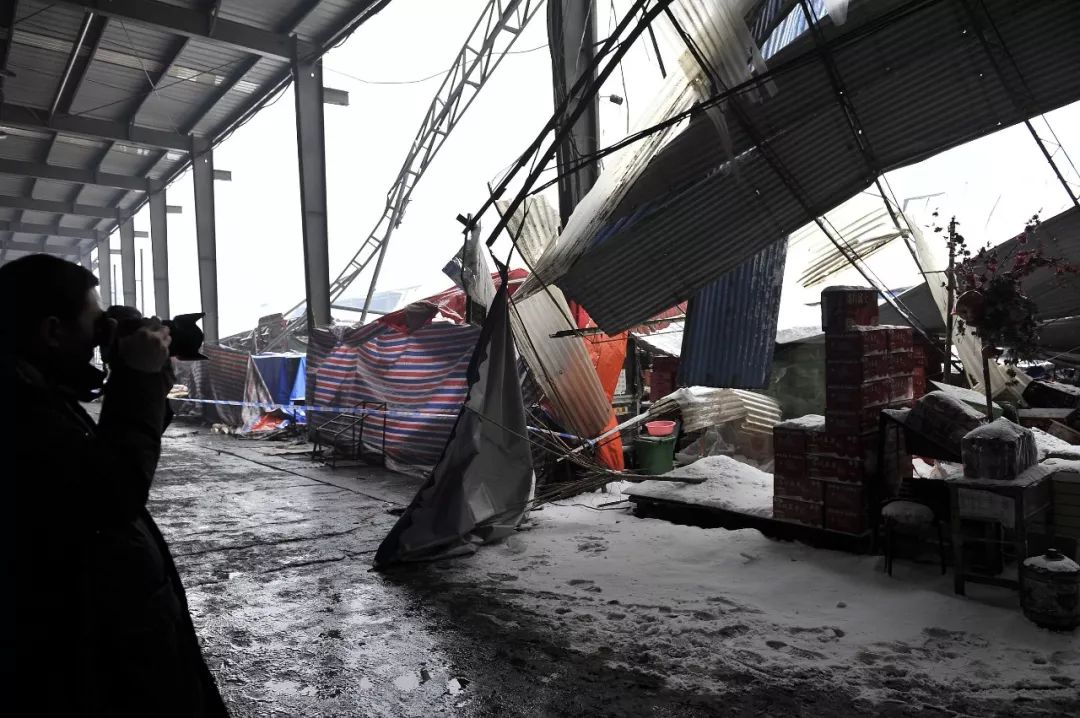 △1月6日上午,陕西西安市胡家庙果品批发市场大棚被积雪压塌,导致8人受伤。(图/视觉中国)
