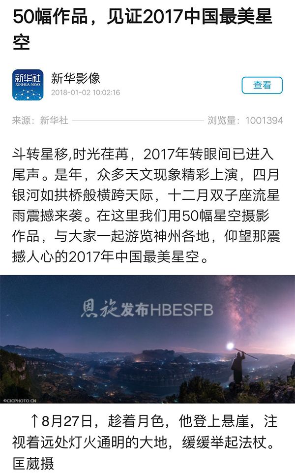 80后男生一枚,土生土长的恩施人,爱摄影,爱美食,爱足球,爱生活。自从2016年爱上星空摄影后一发不可收拾。他对记者说:“能透过自己的镜头,让大家见识恩施星空的美丽,是我的义务。拍星其实很辛苦,你会面对潮湿、寒冷、孤独、野兽……但当你抬头仰望漫天繁星和璀璨银河的时候,你会发现,所有一切都值得。”