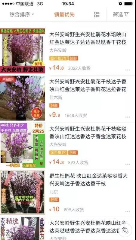 记者浏览某购物网站,“水培杜鹃、干枝、泡水开花、干柴枯木逢春花”这些关键词下面配的图,均是兴安杜鹃花,还有店家特地加上了“人工培育”和“自家种植”的字样。只有极少的店家还在产品描述里写“兴安杜鹃干枝”。