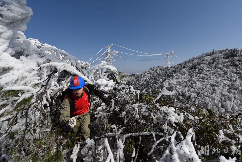 1月9日,在海拔1395米的恩施州咸丰县丁寨乡山峰上,国家电网湖北送变电工程有限公司运行维护人员检查±800千伏复奉线958号铁塔。当日,在连续多天的雨雪后,天气放晴,气温仍在零下6℃,电网工人持续在冰雪覆盖的特高压电网现场蹲守巡查,以确保电网安全稳定运行。图为电网工人在冰山中穿行。邹小民 摄