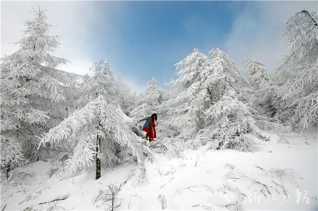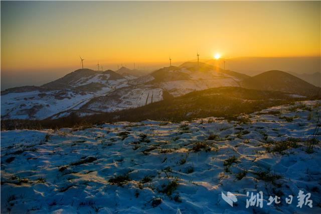 1月3日起,利川普降大雪。雪霁初晴,湛蓝的天空下,雾凇、雪山与数十座大型风车相映成趣。夕阳西下,美丽的晚霞投影到皑皑白雪,宛若阿尔卑斯山冬季童话世界。好一个银妆素裹、冰雕玉砌的雪国世界。