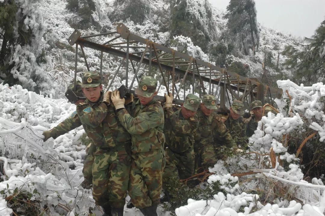 2008年2月6日是农历大年三十,驻桂部队某装甲部队的五百多名指战员争分夺秒抢修电线电塔,以求尽快恢复受冰雪灾害破坏的输电线路。图为装甲旅指战员在冰山雪岭运送电网铁架。新华社记者 何丰伦 摄