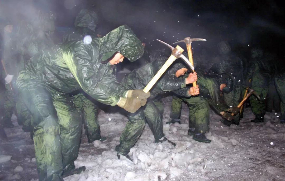 2008年2月3日,一名武警战士在京珠高速公路破冰铲雪间隙用冰解渴。新华社发