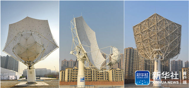 这是SKA——平方公里阵列射电望远镜首台天线样机的正面(左)、侧面(中)和背面(2月6日摄,拼版照片)。新华社记者 牟宇 摄