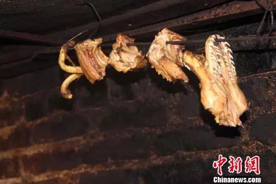 西盟县森林公安局刑侦大队大队长赵正春说:“在岩某家中发现疑似蟒蛇皮一张,长约4米,然后是蛇肉、蛇油一部分,蛇骨头半小盆。”