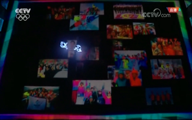 演出现场四块大屏幕播放视频,展现熊猫信使飞跃中国各地的各种场景,收集冬日里各行各业中国人民向世界朋友发出的邀请!