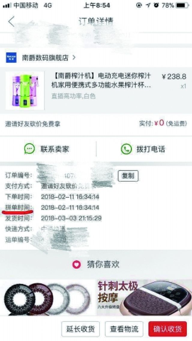潘女士也于2月8日在“拼多多”APP上看到榨汁机砍价活动,“让朋友家人帮忙砍价,2月8日就砍价成功了,当时说2月28日前发货,但一直到3月3日才发货。”潘女士说,之后自己只收到了一根手机数据线。