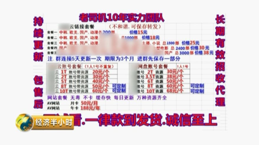这是不是色情网站利用偷窃的大数据,继续进行手机上的色情内容交易呢?为了继续调查,记者通过了这个主动找上门来推销优质资源的微信好友验证。经过几番交谈之后,果然,这位自称为“十年老司机”的人就在微信上向记者发来了一张密密麻麻的图表,点开这张图表,记者看到,这是一张专业的色情视频收费示意图,表明他们可以提供三种色情视频套餐,分别是网盘链接套餐和网盘账号套餐,以及网站在线套餐,套餐内容不同,价格也不尽相同。
