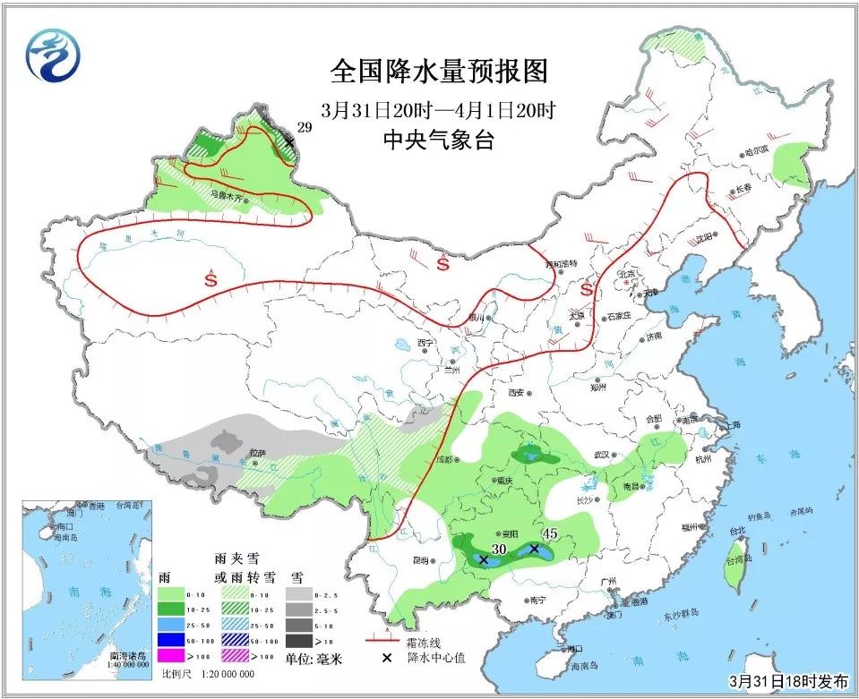 今日天气:新疆、青藏高原、川西高原部分地区有小到中雪或雨夹雪,重庆、贵州、广西、云南部分地区有中雨,局地大雨。