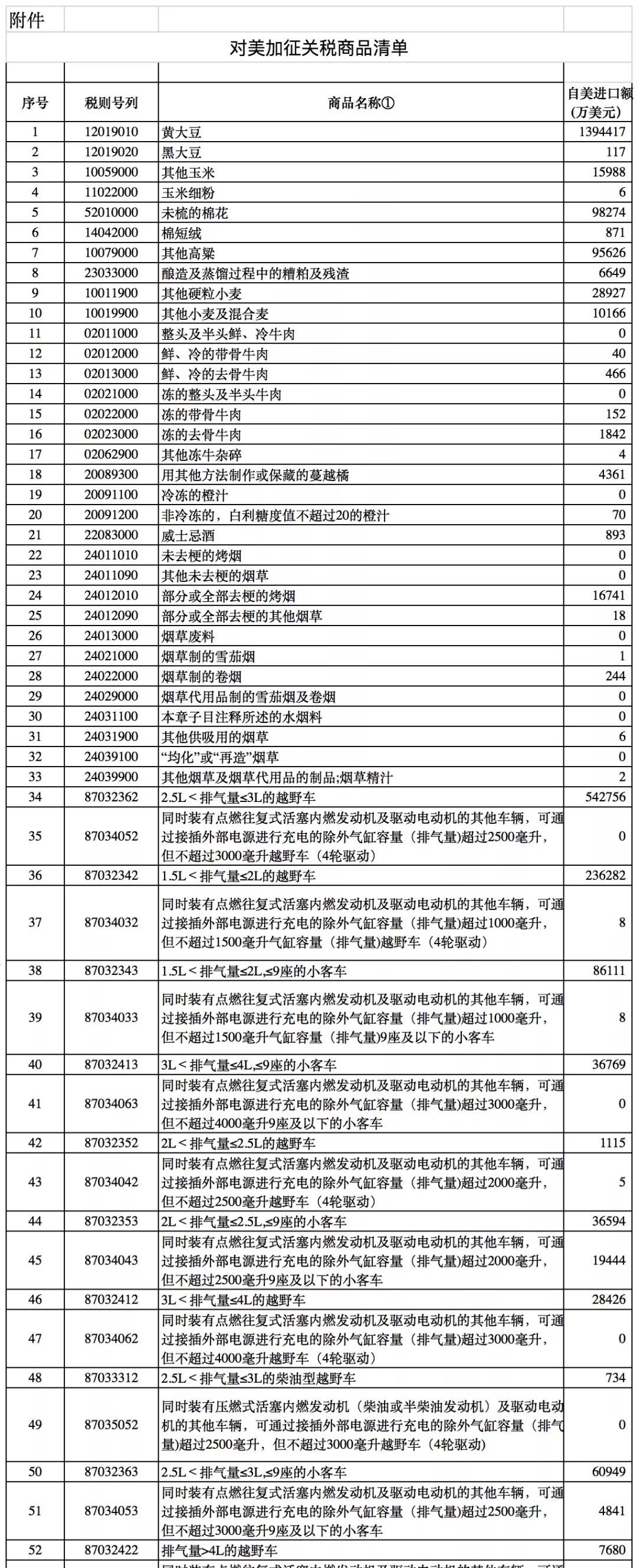 根据《中华人民共和国对外贸易法》和《中华人民共和国进出口关税条例》相关规定,经国务院批准,国务院关税税则委员会决定对原产于美国的大豆、汽车、化工品等14类106项商品加征25%的关税。实施日期将视美国政府对我商品加征关税实施情况,由国务院关税税则委员会另行公布。