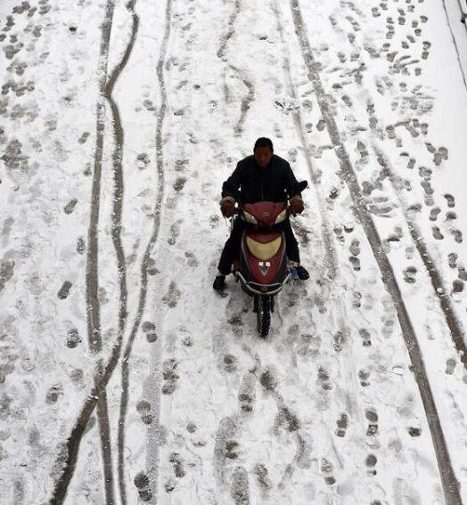 4月5日,在山西太原,一名市民雪后出行。 4月4日至6日,全国大部自北向南自西向东有大风降温天气,部分地区有降雪。 新华社记者 詹彦 摄