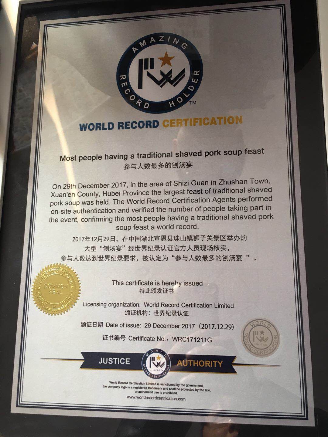 △图为世界纪录认证机构(WRCA)颁发的证书