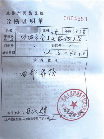 李红告诉记者,4月2日,她在州中心医院中医部进行了相关诊断,诊断结果为“面部异物”。为了让自己心里有底,她在4月3日来到武汉华中科技大学同济医学院附属协和医院进行了诊断,诊断结果相同。