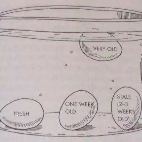 完全平躺在杯底的是最新鲜,稍微往上立的是一周左右的鸡蛋,全部立起来的是2—3周的鸡蛋,浮到水面的就是变质的鸡蛋了。