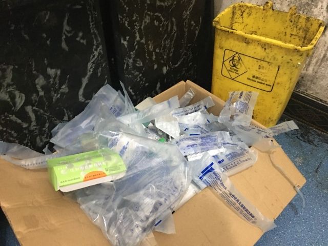 与此同时,该诊所的医疗废物暂存间内还堆放了许多未经处理的废弃物品,药架上摆放着不少过期药品。