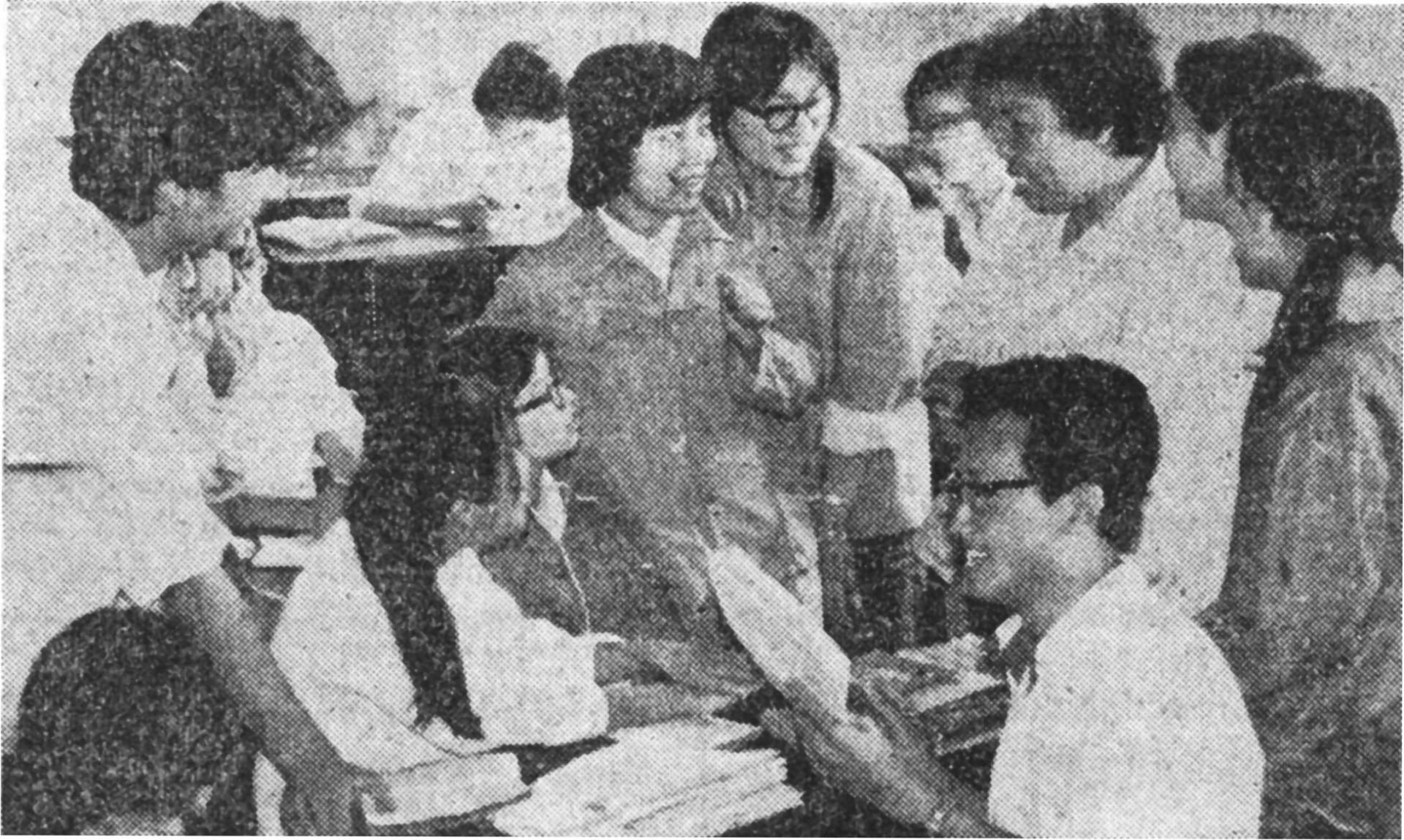 1986年,湖北省武昌实验中学在高考前,对应届毕业生采取加强思想政治工作、传授科学复习方法、搞好卫生保健等多种措施,让学生们的生活过得紧张而活泼,以便有充分的准备迎接高考。图为师生在课间解答疑题。