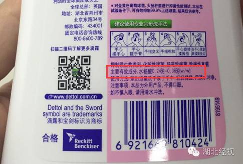 此外,大多数抗菌洗手液所含的抗菌成分为对氯间二甲苯酚或水杨酸、乙醇等,并未包含有19种FDA禁用的化学物质。