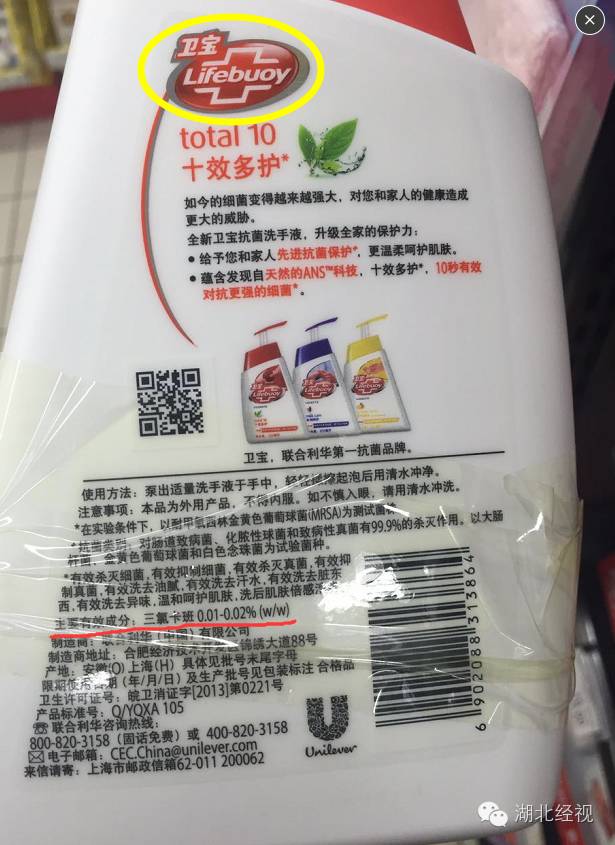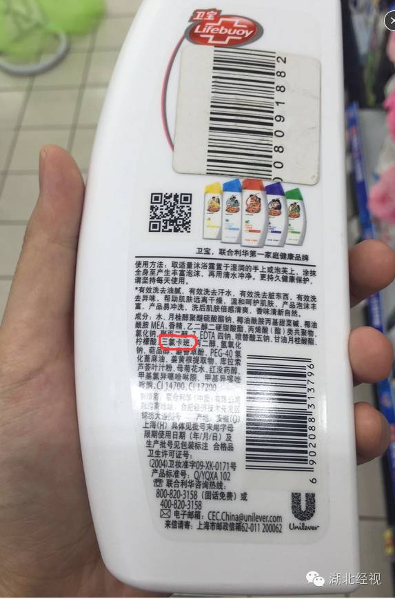 在湖北武汉的一家超市,记者探访洗浴产品专区发现,联合利华旗下卫宝洗手液、沐浴液均含有三氯卡班↓↓↓