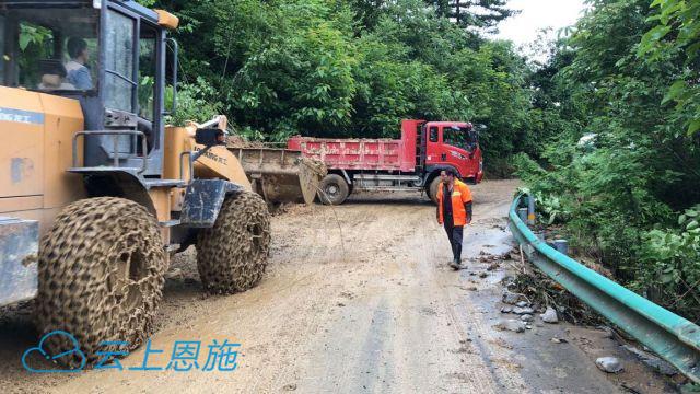 6月20日,宣恩县交通应急保畅工作专班正在G351国道K1738+100-150椿木营境内的深沟大桥处清理道路上的泥石流。