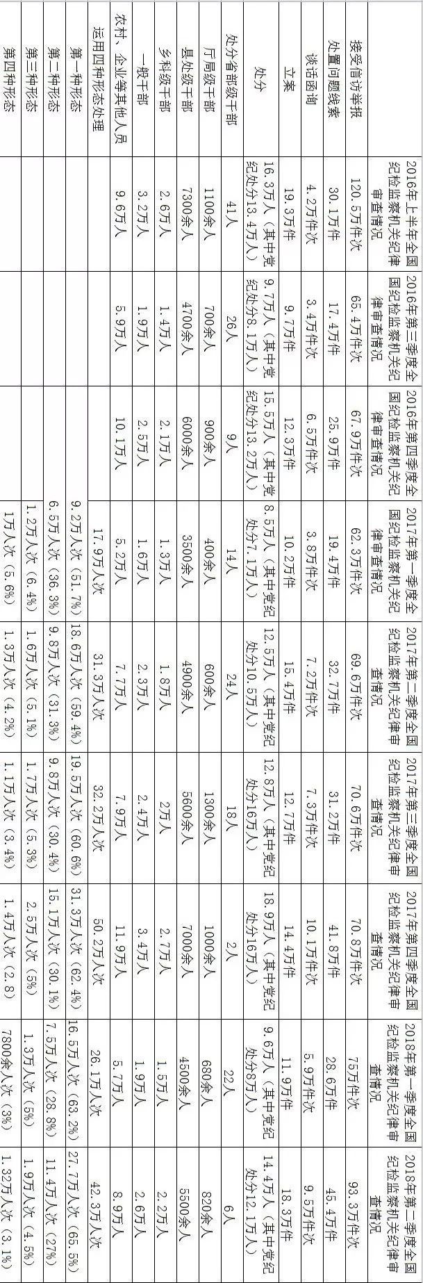 从2016年8月11日起,中纪委网站公布2016年上半年全国纪检监察机关纪律审查情况,此后每季度均会向社会公布会全国纪检监察机关接受信访举报、处置问题线索、谈话函询、立案、处分的数量,以及处分的省部级干部、厅局级干部、县处级干部、乡科级干部、一般干部以及农村、企业等其他人员的数量。从2017年第一季度起,通报还增加了全国纪检监察机关运用监督执纪“四种形态”处理人员的数量,并对第一、二、三、四种形态处理人次和占比均进行了公布。对此,我们作了一个简单的梳理,可以基本分析出2016年以来每个季度的相关数据(见下表,建议横屏看)。